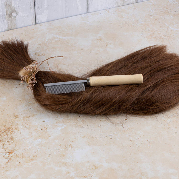 Unser sehr feiner Dreadkamm mit Metallzinken und Holzgriff liegt wunderbar in der Hand und lässt sich wunderbar zum Dreaden verwenden.