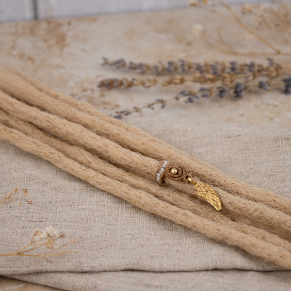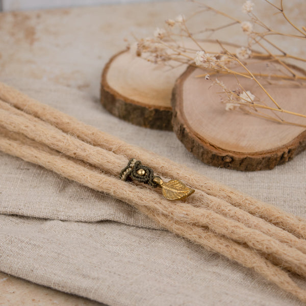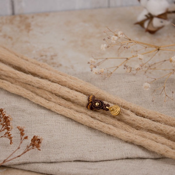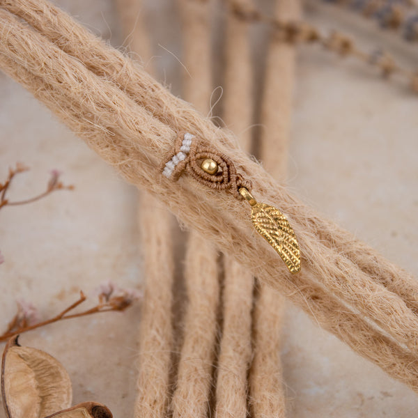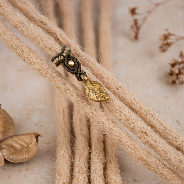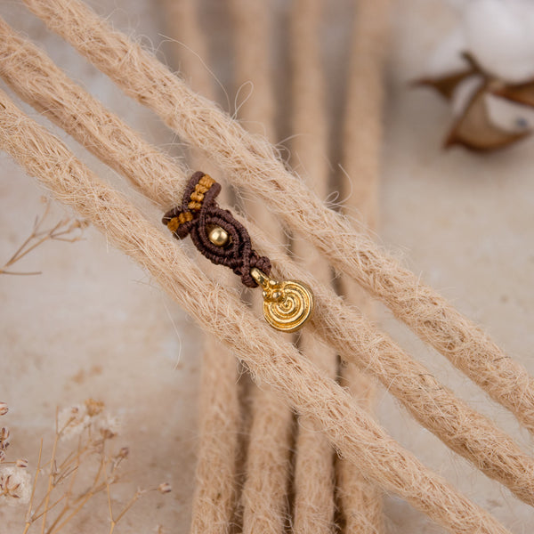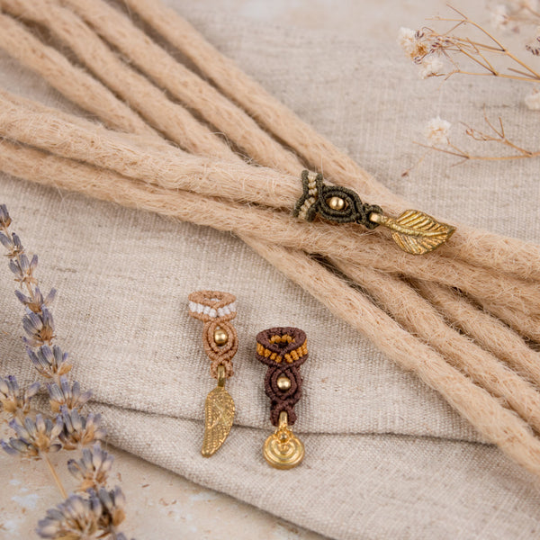 Mit ihren kräftigen Erdtönen und den Messingdetails sind unsere Makramee Dreadperlen definitiv ein besonderer Blickfang in deinen Locs!